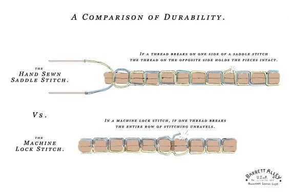 Saddle stitching is sewing by hand with needles and thread in a way that creates two rows of stitching in one single row of holes. If a thread is cut on one side of a saddle stitch, but the other side remains intact, the overall stitch will continue to retain its integrity. Whereas in a machine stitch, if one side of a stitch is broken the entire length of the stitch will be compromised and eventually separate.